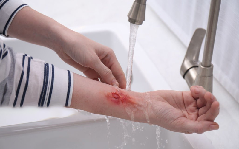 Koel directmet zacht stromend, lauw leidingwater – minimaal 10 minuten. 👉 Let op: gebruik géén ijs, koude kompressen of boter – dat verergert de schade.